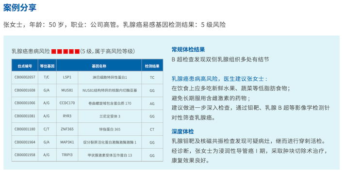愛身譜®乳腺癌易感基因檢測通過檢測受檢者與乳腺癌相關的易感基因,精準評估疾病發(fā)生風險,在疾病發(fā)生之前有針對性的預防,改善自身的生活環(huán)境和生活習慣,從而有效降低或避免乳腺癌的發(fā)生。