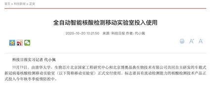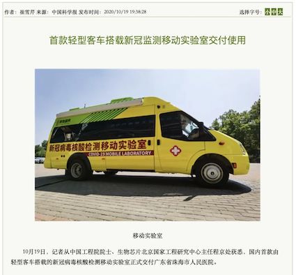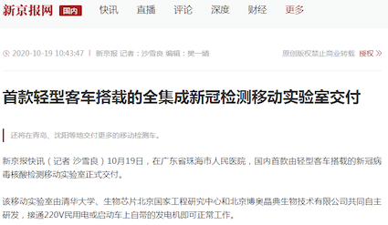 10月19日,“珠海市核酸檢測(cè)基地”在廣東省珠海市人民醫(yī)院正式揭牌啟用。揭牌儀式上,由清華大學(xué)、生物芯片北京國(guó)家工程研究中心和北京博奧晶典生物技術(shù)有限公司共同自主研發(fā)的首款輕型客車(chē)搭載的全集成新冠檢測(cè)移動(dòng)實(shí)驗(yàn)室正式亮相。