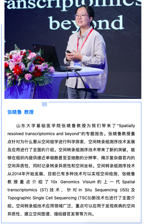 清華大學(xué)醫(yī)學(xué)院研究員、博士生導(dǎo)師,生物芯片北京國(guó)家工程研究中心常務(wù)副主任,博奧生物集團(tuán)有限公司高級(jí)副總裁,北京博奧晶典生物技術(shù)有限公司總裁邢婉麗女士為本次會(huì)議進(jìn)行了開(kāi)幕式致辭。邢婉麗總裁表示單細(xì)胞測(cè)序技術(shù)及空間轉(zhuǎn)錄組技術(shù)在生命科學(xué)和醫(yī)學(xué)研究領(lǐng)域的應(yīng)用日益受到關(guān)注,為高分辨率研究細(xì)胞分群和組織功能研究提供重要的支撐,對(duì)發(fā)現(xiàn)組學(xué)間關(guān)系、記錄動(dòng)態(tài)生物活動(dòng)具有非常重要的意義,為科學(xué)界和醫(yī)學(xué)界更加深入地去認(rèn)識(shí)生命的本質(zhì),解析胚胎發(fā)育過(guò)程、腫瘤發(fā)生發(fā)展、新冠肺炎免疫機(jī)制、發(fā)現(xiàn)新的生物標(biāo)志物和治療靶點(diǎn)等提供全新而絢爛的研究視角。邢婉麗總裁對(duì)所有報(bào)告嘉賓及參會(huì)嘉賓的到來(lái)表示熱烈歡迎及衷心感謝!