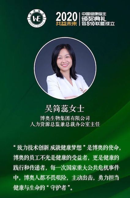 12月18日,由中國(guó)人力資源管理研究會(huì)攜手聯(lián)合國(guó)契約組織國(guó)際WELL建筑研究院、太極禪、世界可持續(xù)發(fā)展領(lǐng)導(dǎo)力組織、上海市著名外企工會(huì)聯(lián)合會(huì)及中智上海技術(shù)經(jīng)濟(jì)技術(shù)合作有限公司等機(jī)構(gòu)共同舉辦的第四屆(2020年)中國(guó)最佳健康雇主評(píng)選在上海揭曉。博奧生物集團(tuán)憑借抗疫期間的卓越貢獻(xiàn),斬獲“抗疫先鋒獎(jiǎng)”并蟬聯(lián)“中國(guó)十佳健康雇主”。