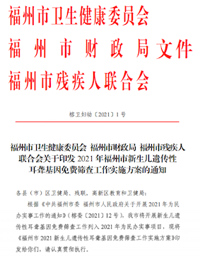 福州市新生兒耳聾基因篩查項(xiàng)目將在5月1日于指定采血機(jī)構(gòu)全面展開,篩查對象為在福州市指定采血機(jī)構(gòu)出生的常住人口新生兒(篩查對象需提供父母一方的身份證、戶口簿或居住證復(fù)印件),采用耳聾基因芯片檢測技術(shù),對新生兒四個(gè)常見耳聾基因的15 個(gè)突變位點(diǎn)進(jìn)行檢測。聯(lián)合物理聽力篩查,準(zhǔn)確做出耳聾病因分析,提出早期干預(yù)措施,減少聽力疾病兒童的發(fā)生率,真正實(shí)現(xiàn)“早發(fā)現(xiàn)、早診斷、早干預(yù)”,達(dá)到有效預(yù)防出生缺陷的目標(biāo),減輕家庭和社會(huì)負(fù)擔(dān),促進(jìn)社會(huì)和諧發(fā)展。