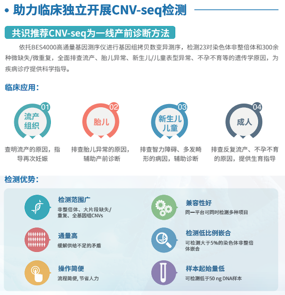 王教授詳細(xì)介紹了博奧基于BES4000平臺(tái)的CNV-seq技術(shù),指出在產(chǎn)前診斷領(lǐng)域引入STR(short tandem repeat,短片段重復(fù)序列)分析的CNV-seq(+)技術(shù),不僅可有效排除母源污染,還可高效檢出三倍體和UPD,提高陽性檢出率。2019年4月發(fā)布的《低深度全基因組測(cè)序技術(shù)在產(chǎn)前診斷中的應(yīng)用專家共識(shí)》指出,具備條件的產(chǎn)前診斷機(jī)構(gòu)可將CNV-seq作為一線產(chǎn)前診斷技術(shù)應(yīng)用于臨床。CNV-seq技術(shù)不僅能輔助臨床判斷胎兒是否存在染色體異常,還能提高復(fù)發(fā)性流產(chǎn)夫婦染色體異常檢出率。
