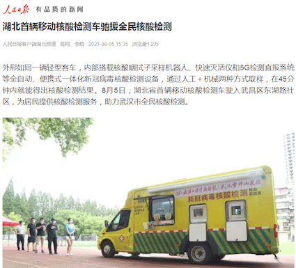 作為科技抗疫的標(biāo)志性成果,新冠病毒核酸檢測移動實驗室可以讓核酸檢測更加準(zhǔn)確便捷,安全快速,接通220V民用電或啟動車上自帶的發(fā)電機即可正常工作,采樣可通過口咽拭子采樣機械臂和人工兩種方式完成。其裝載的全集成芯片實驗室系統(tǒng)45分鐘即可完成全程實驗,最快35分鐘報告陽性結(jié)果,檢測靈敏度可達150拷貝/毫升。如此出色的性能使其特別適合在社區(qū)發(fā)生聚集性疫情和縣鄉(xiāng)村等醫(yī)療條件相對較差的場景下發(fā)揮優(yōu)勢。在為市民完成檢測后,檢測結(jié)果會通過5G通信系統(tǒng)實時上傳到醫(yī)院的核酸檢測實驗室,經(jīng)過審核后上報武漢市衛(wèi)健委的核酸檢測系統(tǒng)?!拜p騎兵”每天可以完成近800份樣品的檢測,為武漢市全民核酸檢測提供有力支持,在此次武漢疫情中發(fā)揮了積極作用。