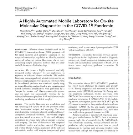 這一抗疫利器的研發(fā)成果以題為"A Highly Automated Mobile Laboratory for On-site Molecular Diagnostics in the COVID-19 Pandemic"的研究論文于2020年4月在國際檢驗醫(yī)學(xué)界權(quán)威雜志《臨床化學(xué)》(Clinical Chemistry)重磅發(fā)表,該論文詳細闡述了“輕騎兵”的性能特點和檢測能力等成果,得到了國內(nèi)外廣泛關(guān)注。該項重量級抗疫攻關(guān)科研成果的發(fā)表,為新冠病毒核酸檢測移動實驗室快速部署醫(yī)療診斷系統(tǒng)提供了一種有發(fā)展前景的解決方案,有助于控制新冠病毒的區(qū)域性傳播。