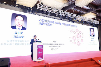 復(fù)旦大學(xué)黨委副書記、復(fù)旦大學(xué)上海醫(yī)學(xué)院黨委書記袁正宏教授作了題為《乙型肝炎病毒感染分子機(jī)制的可視化研究及診療意義》的專題報(bào)告。報(bào)告介紹了研究團(tuán)隊(duì)利用基于 bDNA 的熒光原位雜交結(jié)合免疫熒光技術(shù)及 CRISPR-Tag 活細(xì)胞實(shí)時(shí)熒光失蹤技術(shù),系統(tǒng)性地建立了在體外細(xì)胞和組織系統(tǒng)進(jìn)行原位雜交加熒光、顯色檢測HBV核酸和蛋白可視化的方法。通過可視化技術(shù),研究團(tuán)隊(duì)在亞細(xì)胞水平直接觀察到HBV病毒組分,揭示了HBV病毒部分關(guān)鍵復(fù)制環(huán)節(jié)的細(xì)節(jié),填補(bǔ)了HBV生活史一些關(guān)鍵環(huán)節(jié)的時(shí)空信息。在組織水平觀察到病毒核酸與蛋白的分布特征,反應(yīng)肝臟內(nèi)HBV病毒的生活特征。課題組開發(fā)的可視化技術(shù)可以用來監(jiān)測慢乙肝患者抗病毒治療后病毒蛋白質(zhì)和核酸,尤其 cccDNA 的清除情況,有助于臨床醫(yī)生制訂更好的治療方案,并可為指導(dǎo)開發(fā)新藥物提供幫助。