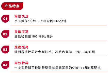 基于全新一代先進(jìn)的芯片實(shí)驗(yàn)室(Lab-on-a-chip)設(shè)計(jì)理念,化繁為簡,檢測時(shí)僅需將樣本保存液加入芯片,封閉芯片后即可上機(jī),手工操作小于1分鐘。生物反應(yīng)全程(包括核酸提取、核酸純化、擴(kuò)增反應(yīng)、核酸檢測和結(jié)果判讀等)均集成在一個(gè)整體密閉、內(nèi)部分區(qū)的微流控芯片內(nèi),由全自動(dòng)核酸分析儀完成,因此無需專業(yè)分區(qū)實(shí)驗(yàn)室,無需人工干預(yù),最大程度降低操作人員感染及樣本間交叉污染的風(fēng)險(xiǎn)。45分鐘完成實(shí)驗(yàn)全過程,最快可在35分鐘內(nèi)檢出新冠陽性樣本,檢測靈敏度可達(dá)150拷貝/毫升,在截至目前國內(nèi)獲批的同類產(chǎn)品中靈敏度最高,真正實(shí)現(xiàn)“樣本進(jìn)-結(jié)果出”。