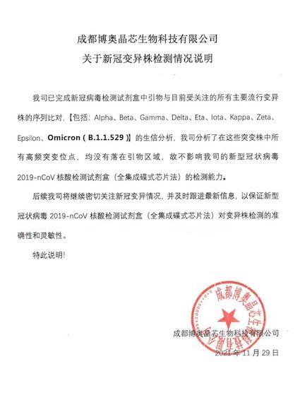 目前,旗下成都博奧晶芯生物科技有限公司已完成新冠病毒檢測試劑盒中引物與目前主要流行變異株的序列比對【包括但不限于:Alpha、Beta、Gamma、Delta、Eta、Iota、Kappa、Zeta、Epsilon、Omicron(B.1.1.529)】,結(jié)果證實(shí):博奧晶典已上市的新型冠狀病毒2019-nCoV核酸檢測試劑盒(全集成碟式芯片法),不會出現(xiàn)脫靶和漏檢的情況。后續(xù),博奧晶典將持續(xù)緊密追蹤全球新冠病毒變異株的最新動(dòng)態(tài)并及時(shí)跟進(jìn)最新信息,確保全集成新冠病毒核酸檢測芯片試劑盒對變異株檢測的準(zhǔn)確性和靈敏性。